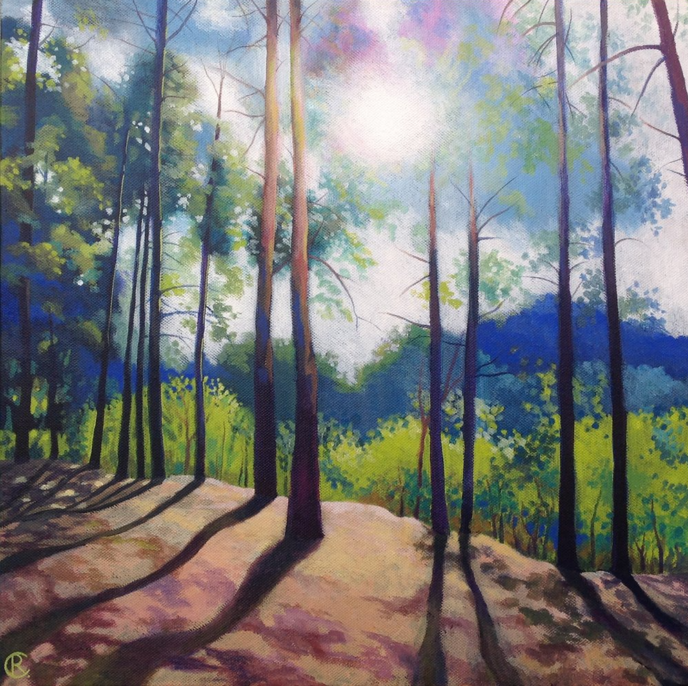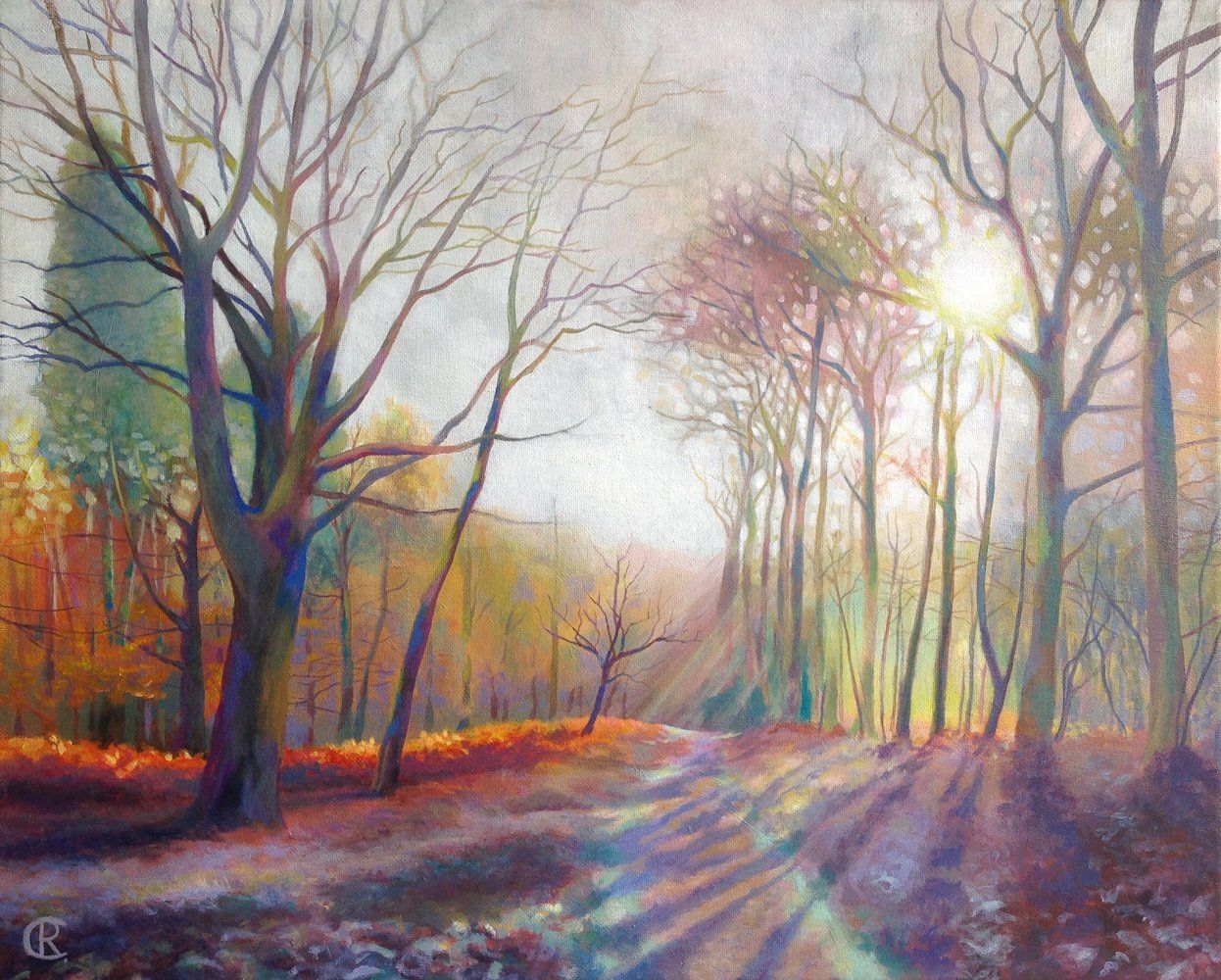 In 2021, in lockdown, where time was plentiful, I have been working on a series of paintings exploring the effects of sunlight and the changing seasons in woodland, mainly in the Crown Estate Windsor, which is my favourite dog walking route.